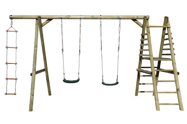 W skład zestawu wchodzą: konstrukcja drewniana, 2 siedziska, drabinka sznurkowa, zestaw montażowy, instrukcja.