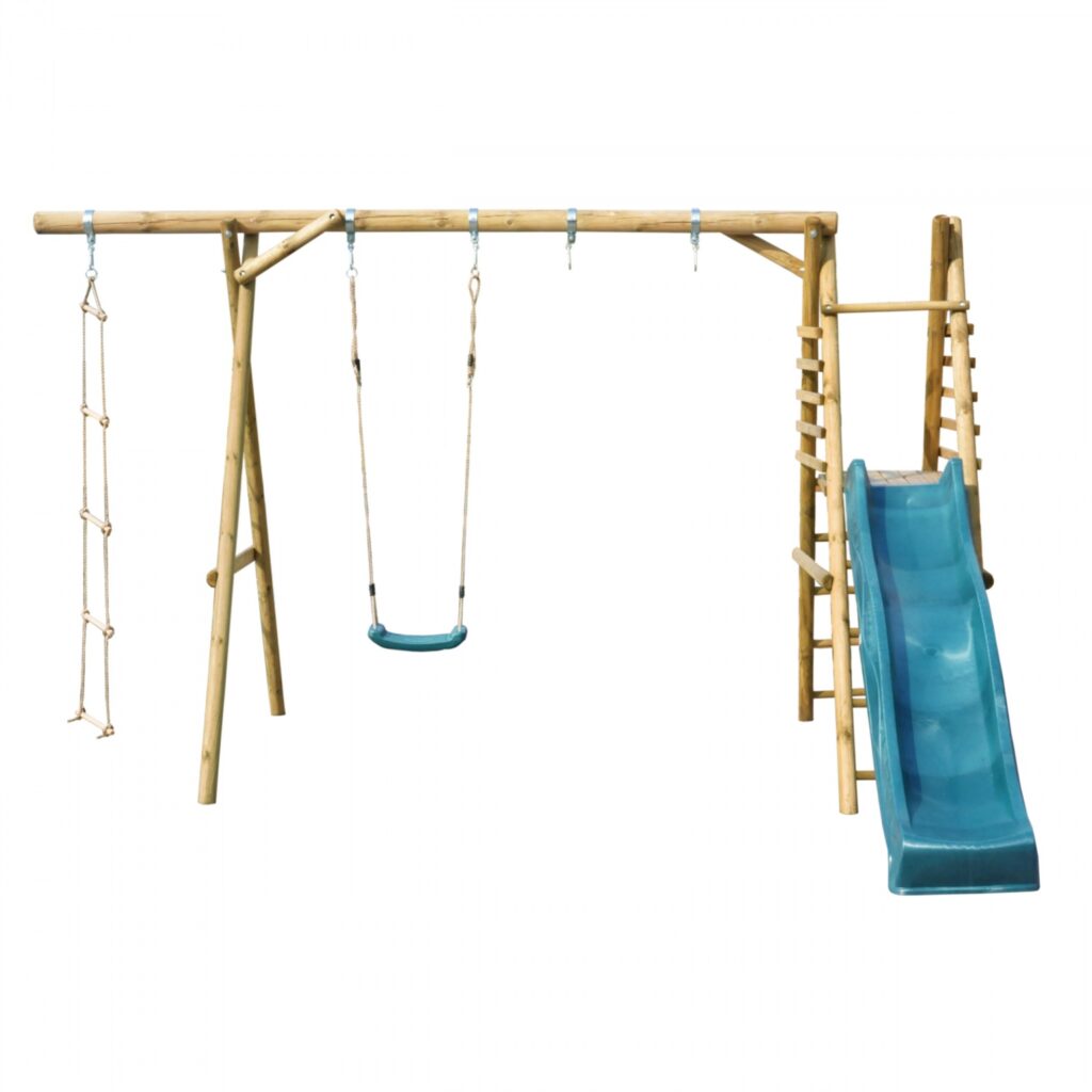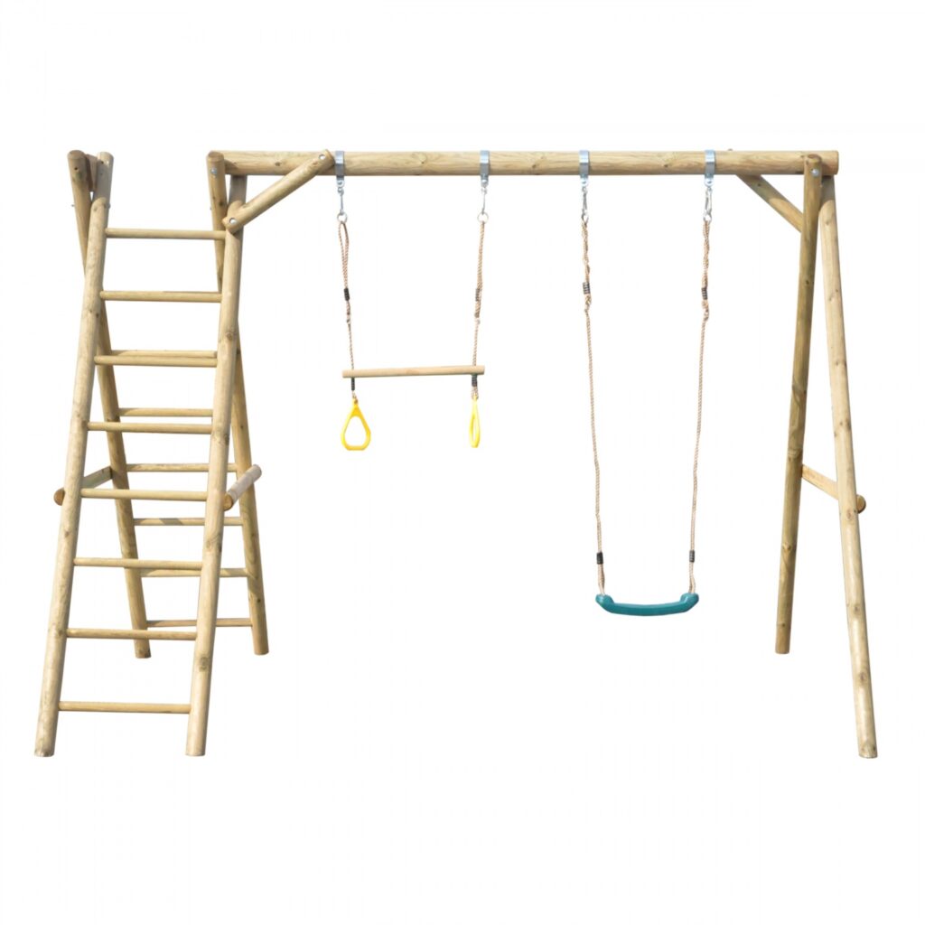 W skład zestawu wchodzą: konstrukcja drewniana, 2 siedziska, zjeżdżalnia, drabinka sznurkowa, zestaw montażowy, instrukcja.