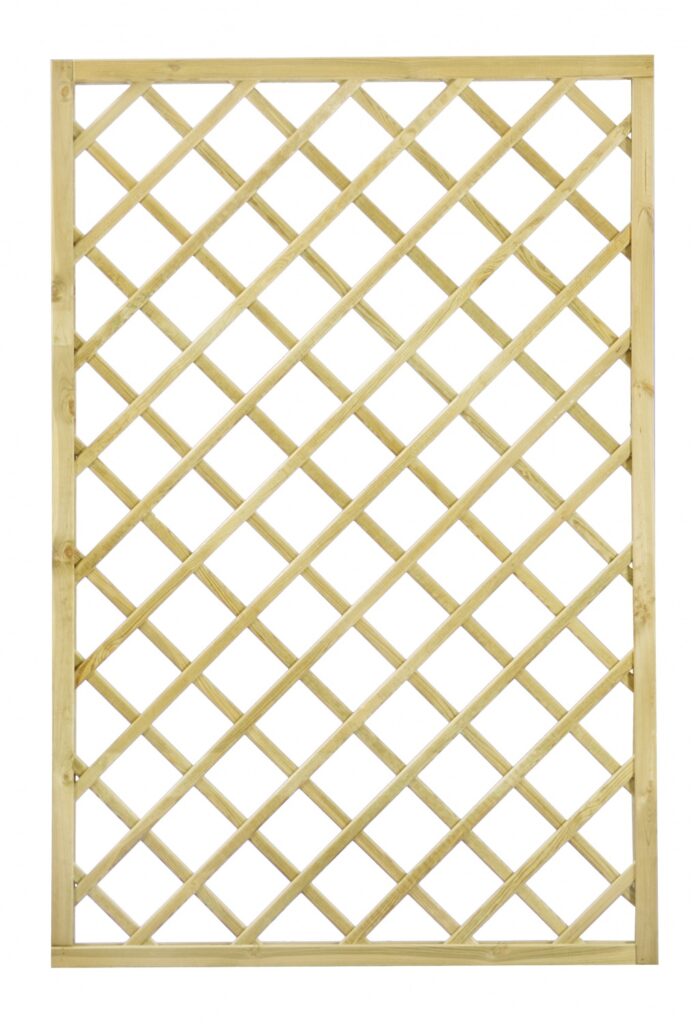 Kratka DIAGONALNA BJORK R34 prosta 180×180 stanowi element architektury ogrodowej służący do aranżacji ogrodu jak i do stworzenia niepowtarzalnego otoczenia wokół domu. Jej połączenie z pnącymi roślinami daje możliwość wykonania wielu pięknych i eleganckich kompozycji. Kratka stanowi również doskonałą podporę dla roślin, wspomagając tym samym ich wzrost. Dzięki niej jesteśmy w stanie samodzielnie wykreować wymarzoną  strefę wypoczynku i relaksu. Ażurowa konstrukcja wraz z roślinami zapewni przyjemny cień oraz kameralne otoczenie, jednocześnie umożliwiając stały dostęp świeżego powietrza. Drewno zostało zaimpregnowane ciśnieniowo, co gwarantuje ochronę  przed działaniem niesprzyjających warunków atmosferycznych, a także przed szkodnikami i grzybami.  Dodatkowym atutem jest możliwość pomalowania kratki na dowolny kolor.