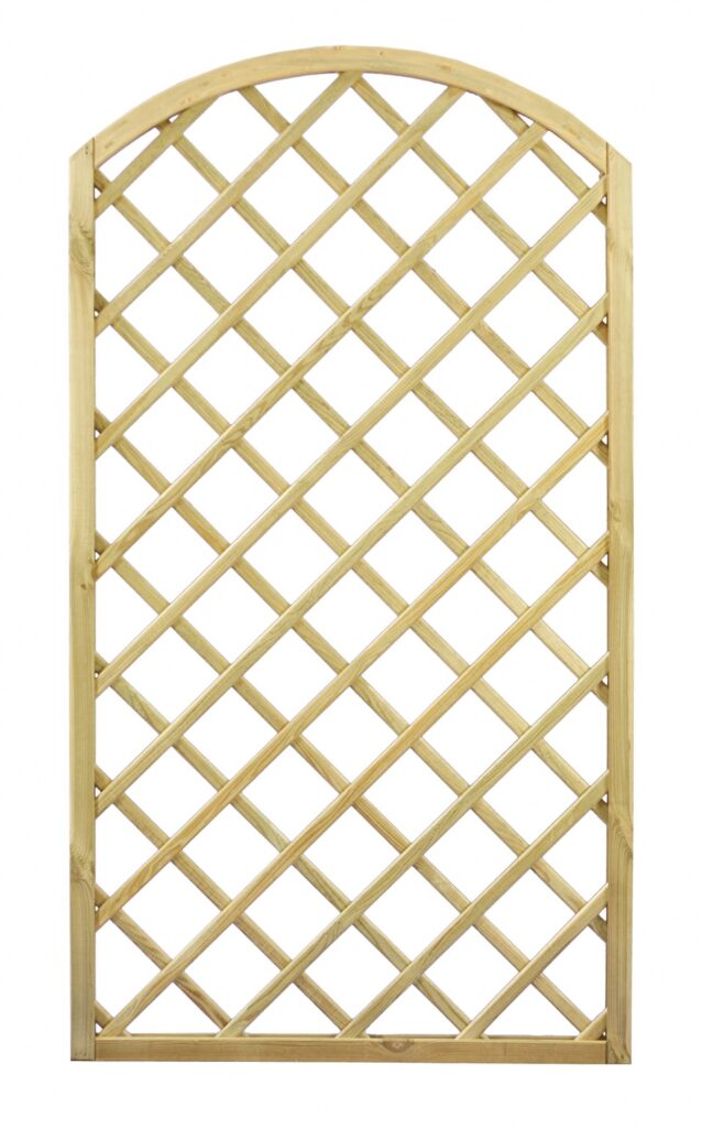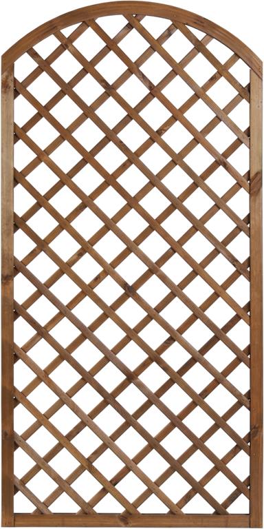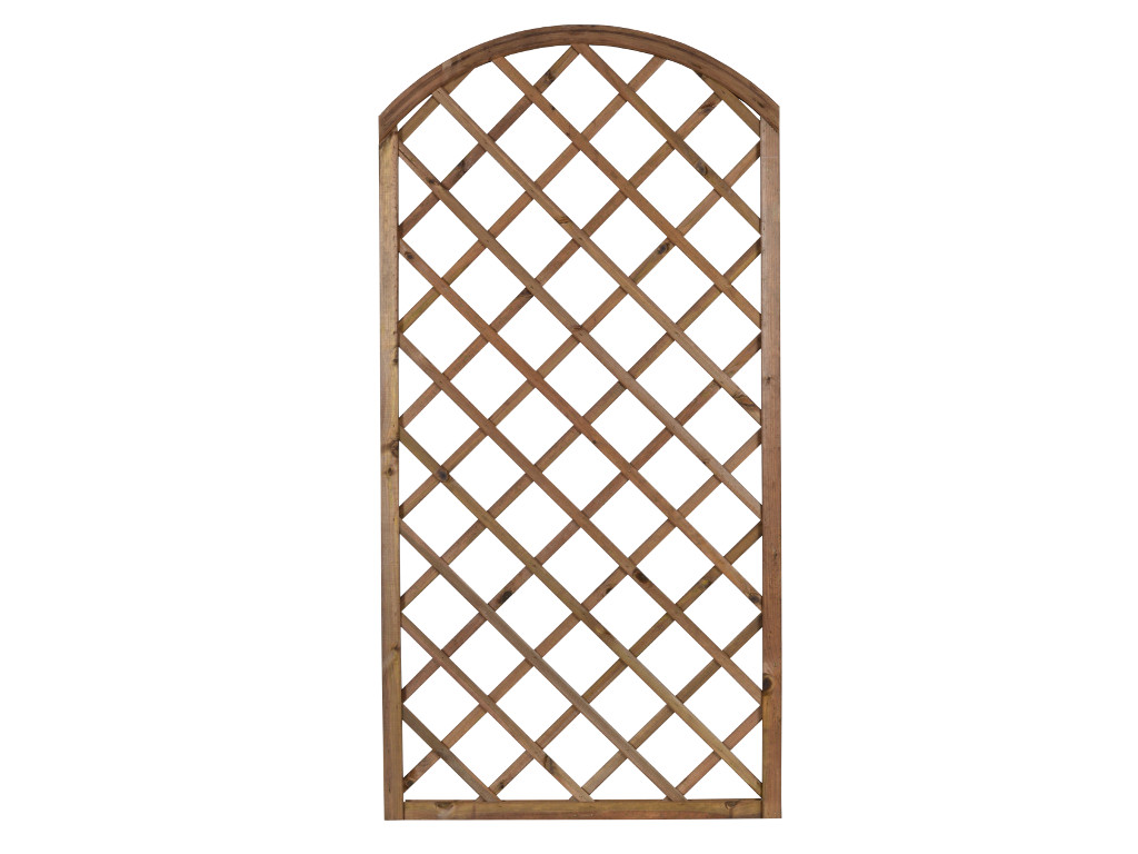 Kratka DIAGONALNA R34 PIA z łukiem 90×180 stanowi element architektury ogrodowej służący do aranżacji ogrodu, jak również do stworzenia niepowtarzalnego otoczenia wokół domu. Jej połączenie z pnącymi roślinami daje możliwość wykonania wielu pięknych i eleganckich kompozycji. Kratka stanowi również doskonałą podporę dla roślin, wspomagając tym samym ich wzrost. Dzięki niej jesteśmy w stanie samodzielnie wykreować wymarzoną  strefę wypoczynku i relaksu. Ażurowa konstrukcja wraz z roślinami zapewni przyjemny cień oraz kameralne otoczenie, jednocześnie umożliwiając stały dostęp świeżego powietrza. Kratkę można także zamontować na balkonie w celu zachowania większej prywatności, a pnące kwiaty dodatkowo go upiększą. Drewno zostało zaimpregnowane ciśnieniowo, co gwarantuje ochronę  przed działaniem niesprzyjających warunków atmosferycznych, a także przed szkodnikami i grzybami i jednocześnie wybarwia drewno  ciepłym brązowym kolorem.