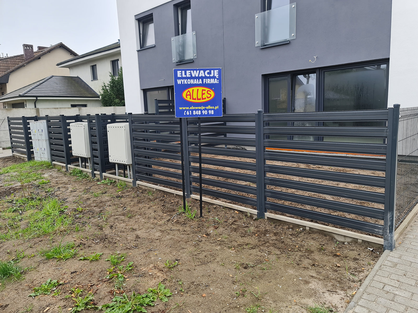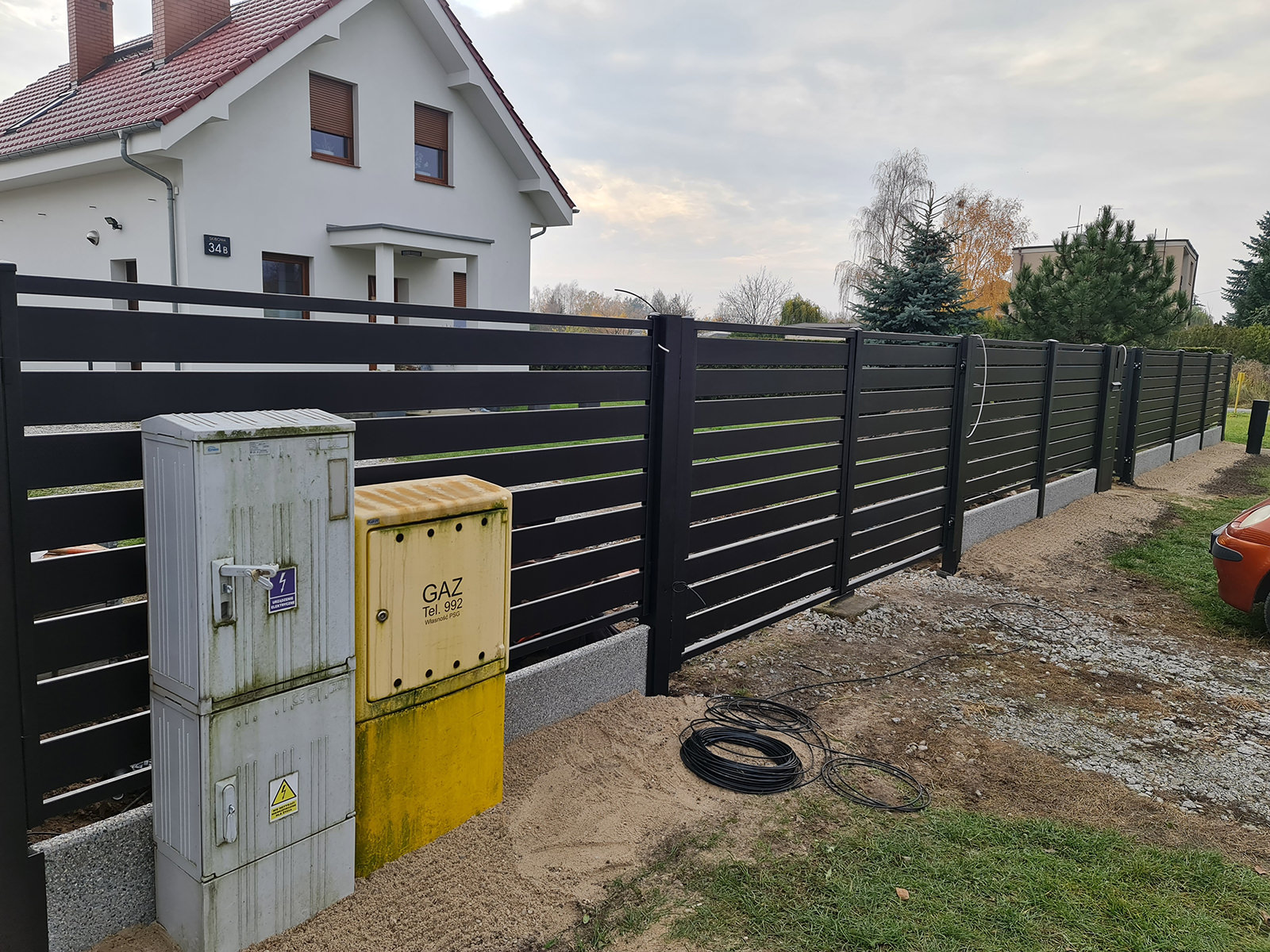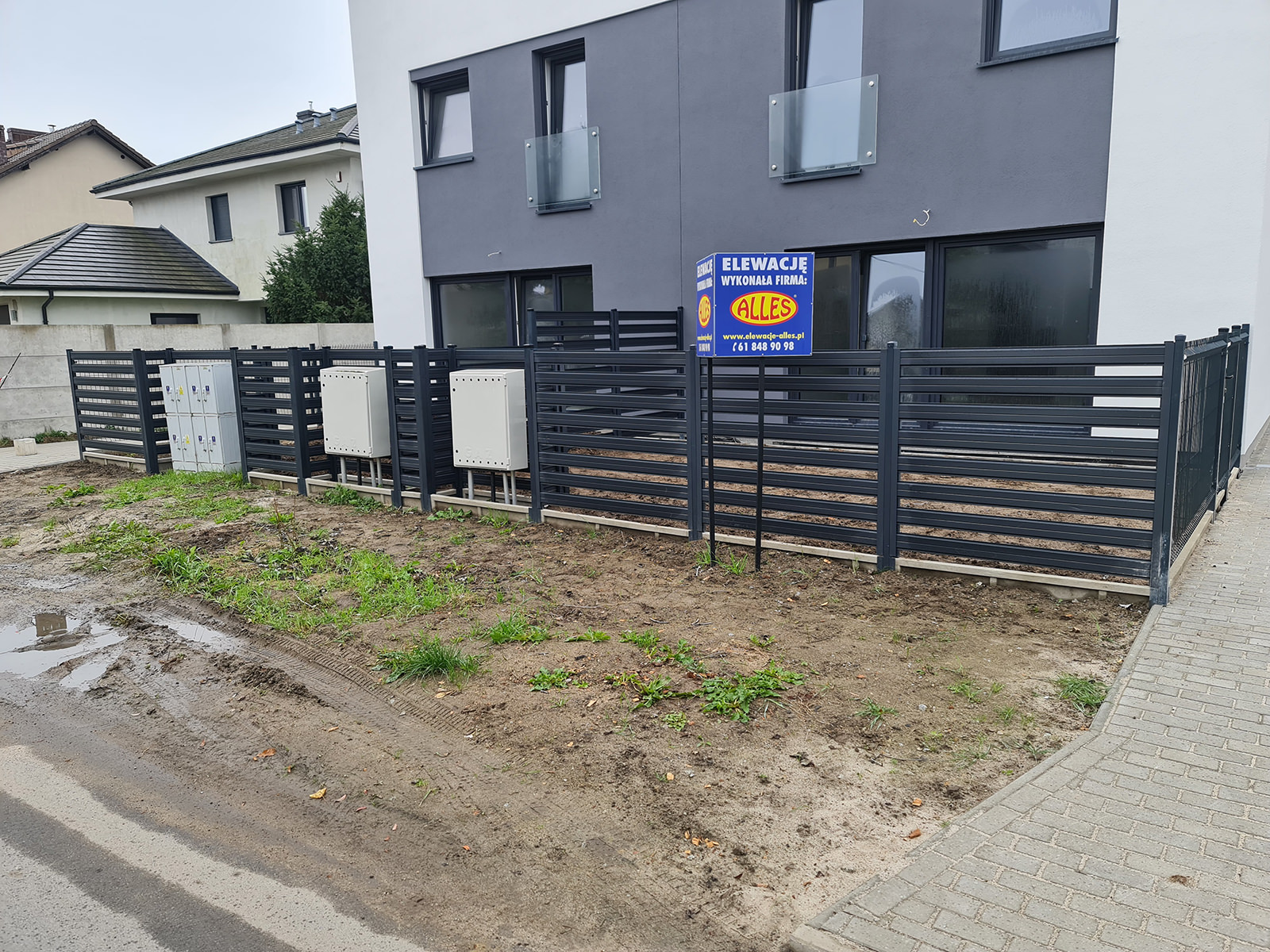 Nowoczesne ogrodzenie frontowe, poziome, centerbox – wykonanie i montaż ogrodzenia poziomowego frontowego, furtki oraz centerboxu.