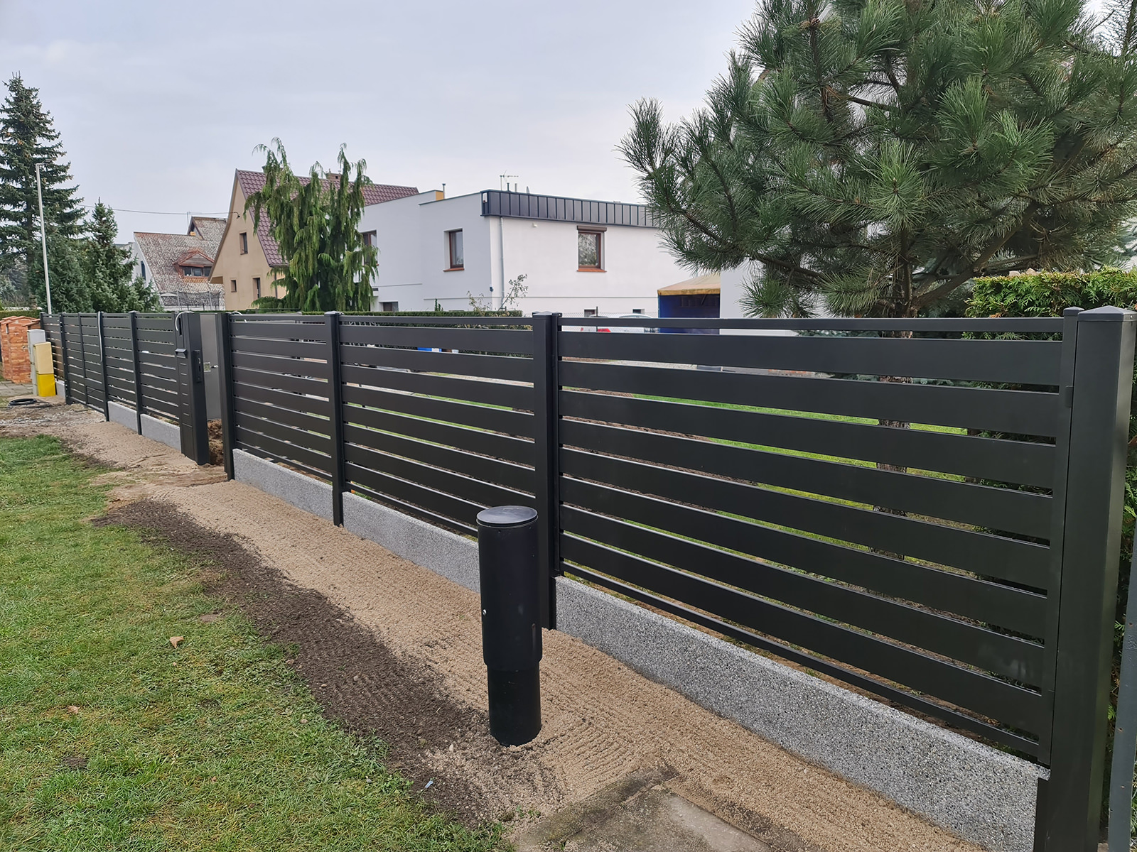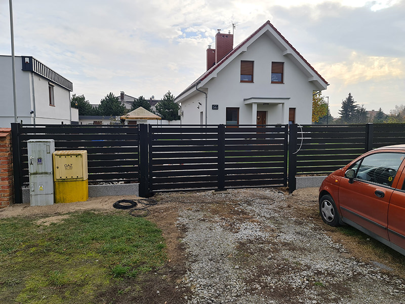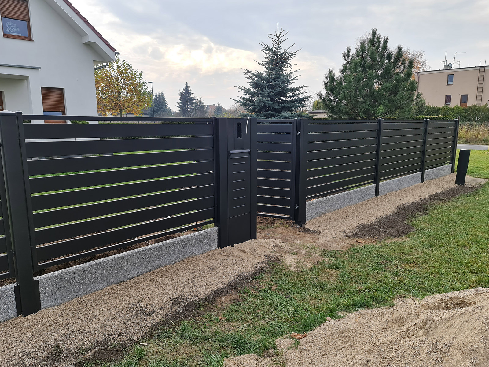 Nowoczesne ogrodzenie frontowe, poziome, centerbox – wykonanie i montaż ogrodzenia poziomowego frontowego, furtki oraz centerboxu.