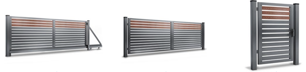 • Wypełnienie: Profile metalowe 80×20 mm o strukturze imitującej naturalne drewno (szczególna powłoka nadająca wygląd drewnianych lameli); bardzo małe przerwy między profilami – około 20–30 mm – dla zachowania prywatności; rama w bramach i furtkach 60×40 mm; profil bramowy 80×80 mm; spawy konstrukcyjne ukryte w profilu ceowym (niewidoczne dla oka).
